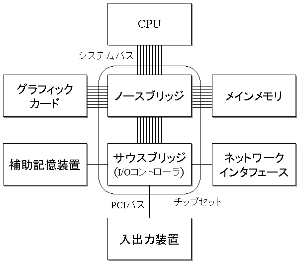 ただし、近年のハードウェアは、高速性などのために、 コンピュータの種類によって構成要素間の接続方法を工夫しており、 必ずしも図4のようになるとは限らない。 例えば、パーソナルコンピュータでは接続される入出力装置が多く、 I/Oコントローラとメインメモリの両方をシステムバスによりCPUに接続すると、 システムバス上を流れるデータ量が多くなってしまうため、 図5に示すように、この部分を分離するノースブリッジと呼ばれる 専用のコントローラを用意することが多く、 また、各種入出力装置の中でも、 モニタに画面を出力するための装置であるビデオカードは高速性を問われるため、 専用のバスにより接続されることが多い。