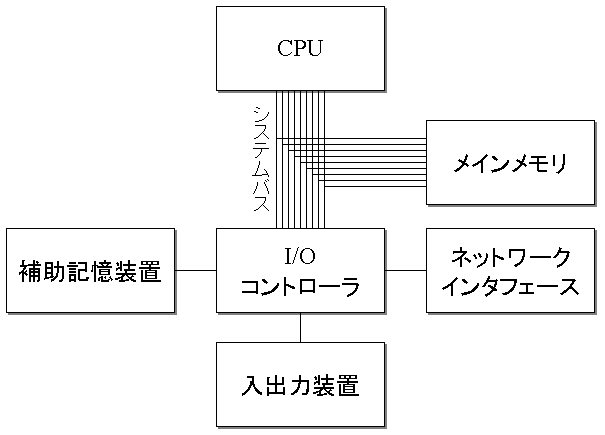 これらのハードウェアの構成要素は、 図4に示すように、システムバスを介してCPU、メインメモリ、 I/Oコントローラが接続され、 また、その他の補助記憶装置や各種入出力装置、 ネットワークインタフェース等は、I/Oコントローラに接続される。