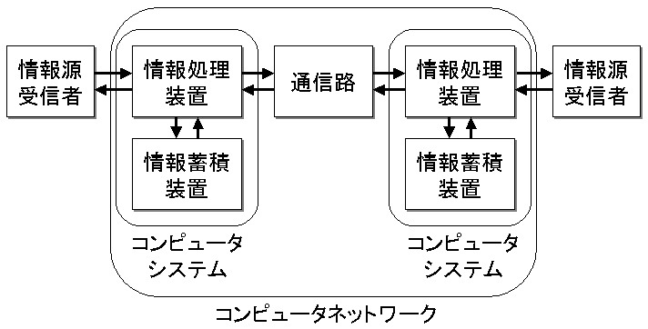 この場合、A、Bはそれぞれ情報源、受信者の両方となり、 また符号化と復号化の両方の機能を実現する情報処理、 および符号の記録が必要となる。 これは、図3に示す、コンピュータとネットワークからなる、 情報ネットワークシステムのモデルと対応付けることができる。