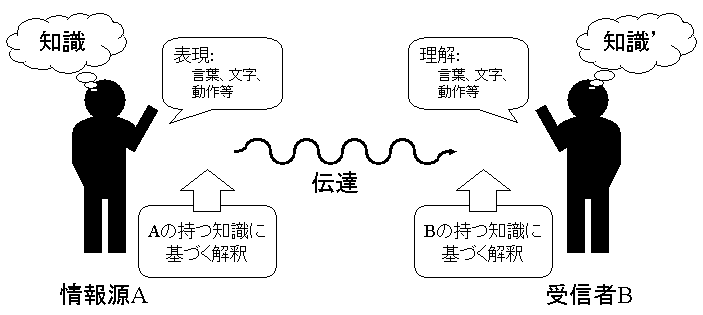 このとき、Aのが伝えようとする「知識」は、 Aの持つ知識に基づく解釈により表現、伝達され、 また、Bの受け取った表現は、Bの持つ知識に基づく解釈により 「知識 '」として理解されるため、 必ずしも「知識」=「知識 '」とはならないことに注意。