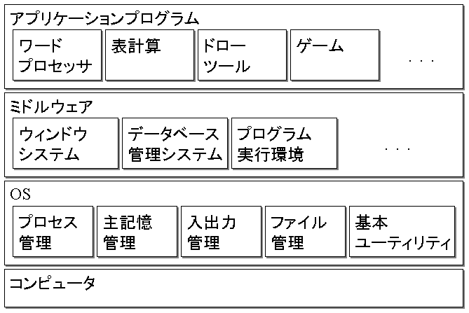 コンピュータシステムをソフトウェアの側面から見た場合、 一般に、その構成要素は以下のようになる。